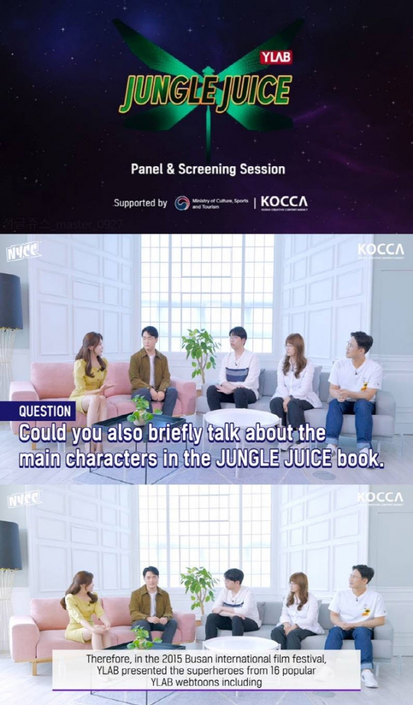 ‘패널앤스크리닝’ 코너는 전 세계에서 주목받는 대중문화 콘텐츠를 제작진들이 글로벌 팬들에게 직접 소개하는 뉴욕 코믹콘의 인터뷰 코너다. 3명의 작가는 웹툰 ‘정글쥬스’ 작가들의 이야기와 제작 의도, 비하인드 스토리 등을 소개했다